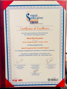 शैक्षिक क्षेत्रमा उल्लेखनीय योगदान पुर्याउँदै आएका डिभाइन टेम्पल एकेडेमी, तुल्सीपुर, दाङ का प्रिन्सिपल, भोजराज न्यौपाने, नेपाल एजुकेशन अवार्ड यूके–२०२५ मा ‘बेस्ट प्रिन्सिपल अफ द इयर–२०२५’ को उपाधिबाट सम्मानित भएका छन्।